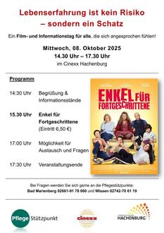 Auch in diesem Jahr laden die Pflegestützpunkte des Westerwaldkreises und des Kreises Altenkirchen in Kooperation mit dem Cinexx Kino Hachenburg wieder zum Film- und Informationstag am 08.10.2025 ein.