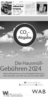 In dieser Ausgabe finden Sie die neue Broschüre „Hausmüllgebühren 2024“ des Westerwaldkreis-AbfallwirtschaftsBetriebes (WAB). Sollte das Infoblatt fehlen, erhalten Sie es wie immer kostenlos bei den Verbandsgemeindeverwaltungen, bei der Kreisverwaltung sowie beim WAB in Moschheim. Postalische Zusendungen der Broschüre sind leider nicht möglich.