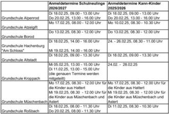 Kinder, die zwischen dem 01.09.2019 und dem 31.08.2020 geboren sind, werden im Schuljahr 2026/2027 schulpflichtig und müssen zu den u.g. Terminen in der jeweiligen Grundschule angemeldet werden.