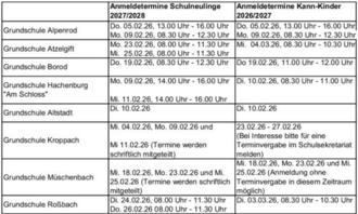 Kinder, die zwischen dem 01.09.2020 und dem 31.08.2021 geboren sind, werden im Schuljahr 2027/2028 schulpflichtig und müssen zu den u.g. Terminen in der jeweiligen Grundschule angemeldet werden.