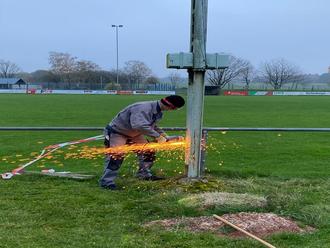 Hiermit bedanke ich mich bei den fleißigen Helfern (Jörg, Mike, Norbert, Bernd und Stefan), die trotz des kühlen Herbstwetters den Weg zum Sportplatz gefunden hatten. Mit Hilfe eines Krans der Fa. D. Otto konnten die Flutlichtmasten umgelegt werden. Danke auch an Carolin Jenny und Bernd, die die Helfer während und nach getaner Arbeit verpflegten.