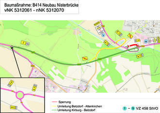 Aus Richtung Betzdorf kommend führt die Umleitung am Abzweig „Nister“ über die L 288 in Richtung Hachenburg, dann über die Behelfsrampe auf die B 414 in Richtung Altenkirchen. Fahrzeuge in Richtung Kirburg drehen im Kreisverkehrsplatz am Knotenpunkt B 414/ B 413.