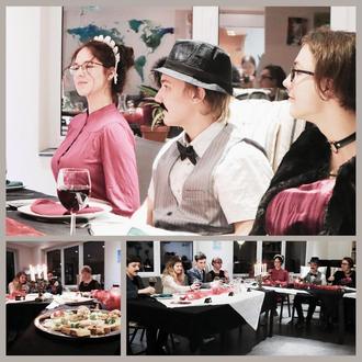 Kuriose Gespräche und lustige Situationen sorgten aber auch bei unserem Kochteam für gute Laune. Dieses zauberte ein 3-Gänge-Menü, ganz dem britischen Königshaus würdig, und wohnte anschließend als Publikum dem bunten Geschehen bei. In verschiedenen Runden wurde hitzig über seltsame Hinweise diskutiert und jeder Einzelne galt als verdächtig - bis zum Schluss, als jeder auf den für ihn oder die schuldige Person deuten sollte. Für die einen überraschend, für die anderen von Beginn an scheinbar klar… bei der Auflösung waren am Ende doch alle verwundert. Unzweifelhaft aber war: Es hat allen so viel Spaß gemacht, dass dies ganz sicher nicht das letzte Krimidinner im JuZe Hachenburg gewesen sein wird.