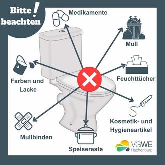 In die Toilette gehören ausschließlich menschliche Ausscheidungen sowie Toilettenpapier. Die folgende Abbildung gibt eine Übersicht über die Dinge, die nicht in der Toilette entsorgt werden dürfen.