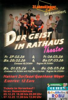 Das Hatterter Lehmeklegger Ensemble präsentiert wieder großes Theater. Bitte beachten Sie, der Kartenvorverkauf findet im ehemaligen Ev. Gemeindehaus dem jetzigen Gemeindezentrum in der Hütterstr. Nr. 9 neben dem Kindergarten am Freitag, den 5. Dezember 2025 von 18.00 bis 20.00 Uhr und am Sonntag, den 7. Dezember 2025 von 11.00 bis 13.00 Uhr statt.