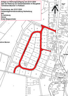 Aufgrund des § 36 Landesstraßengesetzes (LStrG) vom 1. August 1977 (GVBl. S. 273), in der derzeit gültigen Fassung, und der Beschlüsse des Ortsgemeinderates Roßbach vom 13.11.2023 werden die in der nachfolgenden Aufstellung genannten Straßen im Baugebiet „Christinen Bäumen“ in Roßbach als Gemeindestraßen im Sinne des § 3 Nr. 3a LStrG dem öffentlichen Verkehr gewidmet. Die Widmung erstreckt sich auf folgende Grundstücke in der Gemarkung Roßbach: