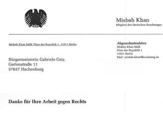 Einen besonderen Dank richtet Misbah Khan an Bürgermeisterin Gabriele Greis, stellvertretend für Ersten Beigeordneten Marco Dörner sowie alle engagierten Bürgerinnen und Bürger für ihre klare Haltung und die Entschlossenheit, in diesem Falle Verantwortung zu übernehmen.