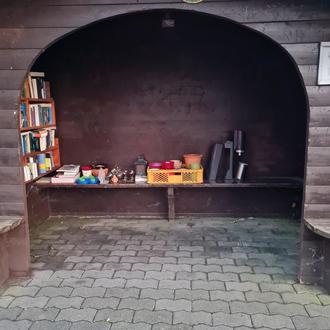 Lediglich das Regal dient zum Ausleihen und Tauschen von Büchern! Es ist absolut untersagt, Taschen, Kartons oder anderes Zeug abzustellen!