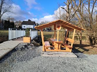 In regelmäßigen Abständen überrascht uns das Team vom Dorfcafé mit neuen Errungenschaften und vielfältigen Spenden an soziale Einrichtungen. Und nun erneut mit einer grandiosen Wander-, Ruhe-, Senioren- und Naturerlebnisbank am Ufer des Rothenbachs.