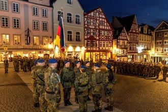 Stadtbürgermeister Stefan Leukel hob in seiner Rede die Bedeutung einer Parlamentsarmee hervor und brachte seinen Dank und Anerkennung gegenüber den angetretenen Soldatinnen und Soldaten zum Ausdruck, bevor das feierliche Gelöbnis der Soldatinnen und Soldaten des Lehrgangs „Allgemeine soldatische Ausbildung für ungedientes Zivilpersonal“ begann und mit einem Handschlag zur Gratulation besiegelt wurde.