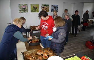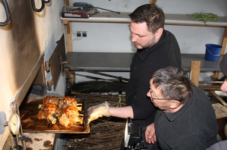 Mittags und noch einmal am Abend wurde der Backes ordentlich angeheizt. Die großen Bleche mit den Schweinshaxen wurden bei über 200 Grad eingeschoben und verbreiteten einen köstlichen Duft. Besonders schmackhaft wurden die Fleischstücke dank einer kleinen Schwarzbier-Dusche kurz vor dem Ende der Garzeit. Serviert wurde dann zum ersten Mal in der renovierten alten Schule. Zur Haxenmahlzeit gehörte traditionell auch deftiges Sauerkraut und frisches Brot. Zusätzlich hatte der Heimatverein frischgebackenen Fleischkäse mit Brötchen im Angebot. Wer seine Portionen nicht zum Mitnehmen bestellt hatte, aß in geselliger Runde in der alten Schule.