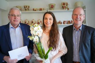 Die kreative Arbeit liegt der ausgebildeten Keramikerin und Keramikgestalterin bereits seit Jahrzehnten am Herzen. In dem historischen Gebäude Am Römerberg 1 hat sie nun den richtigen Ort gefunden, um ihre Leidenschaft zu verwirklichen und ihre handgemachten Werke angemessen zu präsentieren. Dabei handelt es sich in erster Linie um Geschirr und Tischdekorationen mit floralen Elementen. Auch die Einbindung von Kindern in die Thematik rund um den Werkstoff Ton ist ihr ein Herzensanliegen. Aus diesem Grund hat sie eigens dafür einen Raum im neuen Atelier eingerichtet. Dieser kann zum Beispiel für Kindergeburtstage genutzt werden, damit auch die Jüngsten unter entsprechender Anleitung schon kreativ werden können. Bürgermeister Thilo Becker und Stadtbürgermeister Michael Thiesen besuchten Frau Ries anlässlich der Eröffnung ihres neuen Ateliers und gratulierten herzlich zur Eröffnung.