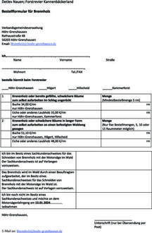 | • | Bestellungen werden ausschließlich in schriftlicher Form, vorzugsweise mit dem in dieser Ausgabe abgedrucktem Formular- auch im Internet unter www.hoehr-grenzhausen.de -Aktuelle Hinweise- oder unter der Emailadresse Brennholz@hoehr-grenzhausen.de entgegengenommen. Letzter Termin hierfür ist der 31. Oktober 2023. |