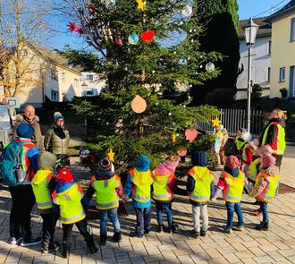 Auch in diesem Jahr haben die Kinder unserer beiden Kindergärten, die im kommenden Jahr in die Grundschule wechseln, den Weihnachtsbaum auf dem Schulhof festlich geschmückt. Mit selbst gebastelten Sternen, Herzen und selbst bemalten, bunten Kugeln leuchtet unser Baum auf dem Dorfplatz nun in der Advents- und Weihnachtszeit ganz wundervoll.