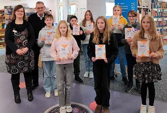 Die Teilnehmerinnen und Teilnehmer des Kreisentscheids Süd des Vorlesewettbewerbs in der Stadtbibliothek Montabaur präsentieren stolz ihre Urkunden. Lukas (zweiter von rechts) sicherte sich mit seiner Leseleistung den Sieg und erhielt eine zweite Urkunde. Er wird nun am Bezirksentscheid teilnehmen. Bibliotheksleiterin Carina Senko (links) und der Beigeordnete der Stadt Montabaur, Harald Hansen (zweiter von links), überreichten gemeinsam die Preise und Urkunden.