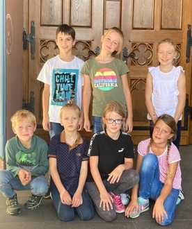 hinten von links Julius Schneider Görgeshausen, Amelie Kramer Heilberscheid und Mina Thude Görgeshausen vorne von links Fabian Büttner Niedererbach, Theodor Frankenstein Görgeshausen, Lilou Werner Görgeshausen und Lilly Buhs Eppenrod Ein Kind ist nicht mit auf dem Bild, Mia Sophie Kaiser aus Niedererbach.