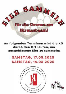 Jetzt ist es nicht mehr lange bis zur diesjährigen Kirmes und Eure Kirmesgesellschaft ist bereits in den Vorbereitungen für dieses schöne Traditionsfest. Wir brauchen, wie in jedem Jahr, wieder viele Eier für die Ommez. Dazu heute schon die Bitte und Aufforderung, ab sofort fleißig Eier auszublasen und für uns zu sammeln. Wir haben zwei Termine, an denen wir durchs Dorf ziehen und die ausgeblasenen Eier einsammeln. Am Samstag, den 17.05.2025 und am Samstag, den 14.06.2025.