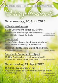 | 6 Uhr | Osternacht in der ev. Kirche in Höhr-Grenzhausen mit Pfarrerin Monika Christ und Pfarrer Carsten Schmitt |
