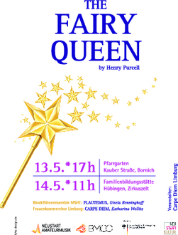 Herzlich Willkommen im Zirkuszelt der Familienbildungsstätte Hübingen, zur Matinee: „The Fairy Queen“. Gestaltet vom Blockflötenensemble MSHT: Flautemus und dem Frauenkammerchor Limburg, am Sonntag, den 14.5.2023 um 11.00 Uhr in Hübingen, Am Buchenberg 1.