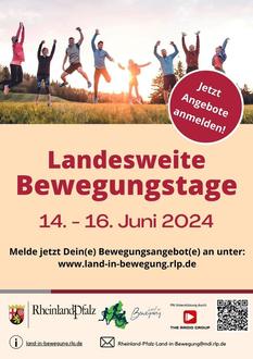 Bereits zum vierten Mal plant die Landesinitiative „Rheinland-Pfalz - Land in Bewegung“ gemeinsam mit vielen Partnern, die landesweiten Bewegungstage vom 14. bis 16. Juni 2024.