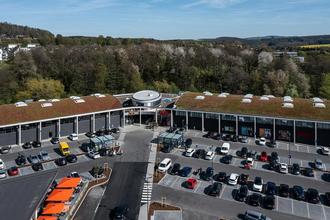 Das neue Einkaufzentrum an Allmannshausen in Montabaur: Auf dem Luftbild kann man die halbrunde Dachkonstruktion mit den begrünten Flächen besonders gut erkennen. (Bild: Michael Breuer / Photokonzept)