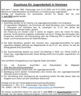 Seit dem 1. Januar 1980, Änderungen zum 01.01.2002 und 01.01.2003, gelten für den Bereich der Stadt Montabaur die Richtlinien zur Förderung der Jugendarbeit. Anträge auf Gewährung von Zuschüssen können für dieses Jahr bis zum 1. Juni 2025 gestellt werden.