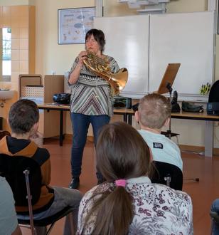 Am 29. April lebte eine beliebte Tradition an der Joseph-Kehrein-Schule Montabaur wieder auf: Das musikalische Klassenzimmer war bei den vierten Klassen zu Gast. Bei diesem Angebot der Rheinischen Philharmonie zeigen die Profis die Vielfalt ihrer Instrumente und präsentieren abwechslungsreiche Musikstücke. Der Hornistin Frau Julia Spiegelmacher gelang es zudem vortrefflich, mit den Grundschülern ins Gespräch zu kommen. Mit Denkanstößen forderte sie die Kinder zum Mitmachen heraus: Gibt es in der Natur Hörner, auf denen Töne geblasen werden können? Wie verständigten sich die Jäger früher über weite Strecken? Was muss der Spieler tun, um unterschiedliche Töne zu erzeugen? Auch die Viertklässler bewiesen ihre Neugierde: „Warum halten Sie beim Spielen eine Hand in den Schallbecher?“, lautete z. B. eine der vielen interessierten Nachfragen. Motiviert von der kindgemäßen und unterhaltsamen Instrumentenvorstellung wurden die Mädchen und Jungen nicht müde, sich eifrig einzubringen. So brauchte es viele Hände, um einen Gartenschlauch zu halten, der verdeutlichte, wie lang das Schallrohr des Horns ist. Hörbeispiele so nah zu erleben, faszinierte alle sehr und es erklang nicht nur bei einer bekannten Melodie aus Harry Potter begeisterter Applaus. Ein herzliches Dankeschön für diesen wunderbaren Besuch und die Einblicke in den Orchesteralltag!