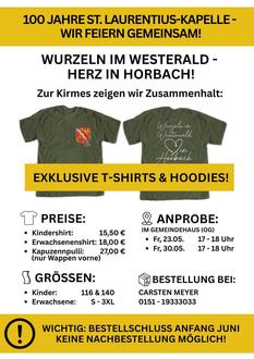 Zum 100-jährigen Jubiläum unserer geliebten St. Laurentius-Kapelle hat sich die Ortsgemeinde Horbach etwas Besonderes überlegt: Stylische T-Shirts und Kapuzenpullis mit unserem Wappen auf der Brust!