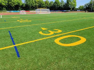 Eine große Erleichterung für die American-Football-Spieler – die (gelben) Markierungen sind nun fest installiert und müssen nicht vor jedem Spiel neu aufgebracht werden. (Bild: Stadt Montabaur, Viola Marschall)