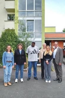 Hand in Hand haben Stadt und VG Montabaur sowie der Westerwaldkreis Haus Roßberg in Montabaur an den Start gebracht. Beim Rundgang mit der Nachbarschaft waren dabei: (v.l.) Hausleiterin Johanna Schubert-Ergün, Stadtbürgermeisterin Melanie Leicher, Hausmeister Ulrick Smith, die Kreisbeigeordnete Gabi Wieland, Teamkoordinatorin Theres Hiob vom Kreisjugendamt sowie Andree Stein, der Erste Beigeordnete der VG. (Bild: Stadt Montabaur / Christina Weiß)