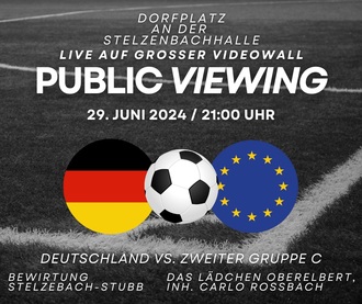 Herzlichen Dank allen Helfern, die in der vergangenen Woche spontan dazu beigetragen haben, das Event zu organisieren! Und es geht weiter: Am Samstag, 29. Juni findet um 21.00 Uhr das Achtelfinalspiel der Nationalmannschaft statt. Stelzebach-Stubb, Das Lädchen und die Ortsgemeinde laden herzlich zum Public Viewing ein! An allen Spielen der deutschen Nationalmannschaft ist ein großes Public Viewing Event am Dorfplatz geplant. Kommt vorbei und feiert mit, wir freuen uns über viele fußballbegeisterte Zuschauer!