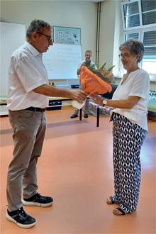 Mit Blumen und einem dicken Dankeschön verabschiedete der Erste Beigeordnete Andree Stein die Schulsekretärin Elke Nebgen von der Joseph-Kehrein-Schule in den Ruhestand. Bild: (VG Montabaur / Christina Weiß)