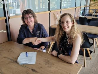 „Auf gute Zusammenarbeit“. Stadtbürgermeisterin Melanie Leicher (l.) und die neue Pächterin Stefanie Hefner bei der Vertragsunterzeichnung für das neue Restaurant „Ambiente“ in der Stadthalle Montabaur. (Bild: Stadt Montabaur, Viola Marschall)