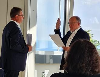Der Erste Beigeordnete, Herr Johannes Ullrich, nahm die Ernennung, Vereidigung und Einführung in das Amt vor und überreichte dem neuen Ortschef symbolisch einen goldenen Schlüssel für die Amtsgeschäfte und das Gemeindezentrum.