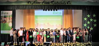 Vor der lang ersehnten Ausgabe der Abschlusszeugnisse wurden die herausragenden Leistungen einzelner Schüler geehrt. Für die besten Leistungen in ihrer Klasse erhielten Arian Günter (9c), Daniel Marichev (9d), Celina Drescher (10a), Lilly Metternich (10b) und Marija Starcevic (10d) den Buchpreis der Schule. Den Preis der Bildungsministerin für vorbildliche Haltung und besonderes Engagement erhielten Leydin Aksel (9d) und Celina Drescher (10a). Darüber hinaus wurden die Abschlussschüler geehrt, die sich unermüdlich in der Sozial-AG einsetzten. Auch die Schüler und Schülerinnen, die sich im laufenden Schuljahr als Paten für die Fünftklässler engagierten oder die Nachmittagsbetreuung unterstützten, erhielten eine Urkunde. Die erfolgreich ausgebildeten Sportassistenten erhielten ihr Zertifikat.