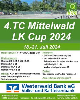 Im vergangenen Jahr veranstaltete der Tennisverein die nunmehr dritte Ausgabe des TC Mittelwald LK Cups. Nach spannenden Matches in den Vorjahren können sich alle Interessierten auf eine Neuauflage des Turniers in diesem Jahr freuen. Zum Turnier laden wir neben allen interessierten Spielerinnen und Spielern alle Sport- und Tennisbegeisterten ein, um auf unserer Tennisanlage in Montabaur - Horressen großartiges Tennis zu genießen. Für das leibliche Wohl ist während des Turniers bestens gesorgt.