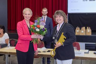 Symbolisch übergab Gabi Wieland (l.) den Schlüssel für das Rathaus an ihre Nachfolgerin Melanie Leicher. Im Hintergrund Bürgermeister Ulrich Richter-Hopprich von der Verbandsgemeinde Montabaur. (Bild: Stadt Montabaur / Olaf Nitz)