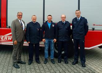 Im Feuerwehrhaus von Nentershausen fand die Versammlung der Jugendwarte statt. Einstimmig wählten sie Jan Schäfer (Mitte) zum Nachfolger von Uwe Rörig, der dieses Amt 33 Jahre innehatte. Mit dabei waren der Erste Beigeordnete Andree Stein (l.) sowie Wehrleiter Jens Weinreifer (r.) und neben ihm sein Stellvertreter Patrick Weyand. (Bild: VG Montabaur / Monique Brill)