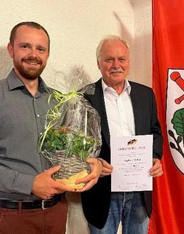 Adrian Börner war 20 Jahre Mitglied des Gemeinderates, darunter 5 Jahre Beigeordneter, und in verschiedenen Ausschüssen ehrenamtlich aktiv. Ortsbürgermeister Neubert überreichte ihm eine Ehrenurkunde des Gemeinde- und Städtebundes Rheinland-Pfalz, ein Weinpräsent und eine Schiefertafel mit persönlicher Gravur.