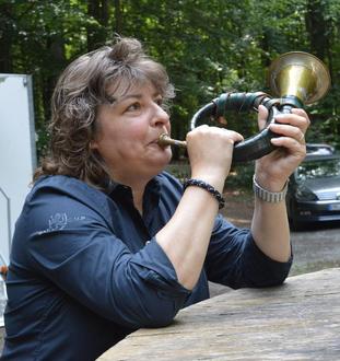 Unverhofft kamen die Kinder aus dem Wald zum Camp, als Stadtbürgermeisterin Melanie Leicher eine kleine Melodie auf dem Jagdhorn blies. Was sie zu diesem Zeitpunkt noch nicht wusste: Das Signal des Jagdhorns ist für die Kinder das Signal, unverzüglich zum Camp zu kommen.
