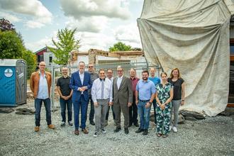 Beim Rundgang über die Baustelle erläuterte Ortsbürgermeister Patrick George dem Innenminister, wie der Lindensaal umgebaut wird und wo der Jugendraum entstehen wird. (Bild: VG Montabaur / Andreas Egenolf)