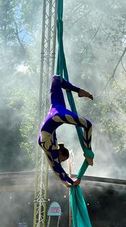 Die junge Artistin Johanna beschäftigt sich seit Jahren mit der Pole-Artistik als faszinierende Disziplin gemischt aus Tanz, Beweglichkeit und Kraft. Sie mixt daraus einen kraftvollen und besonderen Cocktail, der das Publikum sicher auch im Buchfinkenland mehr als einmal mit offenem Mund staunen lässt! Eine besondere Artistin ist auch Iryna. Sie zeigt die hohe Kunst der Akrobatik am Vertikaltuch. Immer sucht sie nach neuen Möglichkeiten des Ausdrucks am Tuch, und Ihre Tricks sind nie alltäglich! Als Moderator und Wortartist brilliert in Hübingen Marcus Jeroch: er unterhält und begeistert mit seinen waghalsigen, eigenwilligen Jonglagen und dem reichen Repertoire an geistreichen Textdarbietungen voller Humor und Tiefsinn. Sowas muss man mal gesehen und gehört haben - so wie schon viele Gäste in den berühmtesten Varietés in Deutschland vom Tigerpalast Frankfurt bis zum Hansatheater Hamburg. Die Programmzusammenstellung lag wie die letzten Jahre in den bewährten Händen des Theatro Artistico.