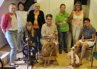 Am Sonntag, den 15. Juni versammelten sich im von der Spinnstube des Westerwaldvereins Daubach unter Führung von Birgit Hartenstein gesponnenen Netz Spinnende und Interessierte aus Nah und Fern zum gemütlichen Spinnen im Daubacher Heimathaus. Neue Freundschaften in der weit verstreuten Fangemeinde wurden geschlossen und alle erlebten einen entspannten Nachmittag, an dem sie gemeinsam spinnen, Erfahrungen austauschen und mehr über diese traditionelle Handwerkskunst erfahren durften. Zwar spielte der Wettergott nicht mit - gerade als man es sich vor dem Museum gemütlich gemacht hatte, kam der Regen - doch die fleißige Truppe konnte ihr Wirken problemlos im oberen Stock des Heimathauses fortführen. So war auch der Weg zur reichhaltigen Kuchentheke des Dorfcafés nicht weit. Die flotte und freundliche Bedienung durch die Kirmesjugend wurde von allen geschätzt. Ein Highlight zum Abschluss war die Führung durch das Daubacher Heimatmuseum, in dem neben vergangenen Alltäglichkeiten auch einige sehenswerte Spinnräder wie z B. das „Hunger-(Spinn-)Rad“ zu bestaunen sind.