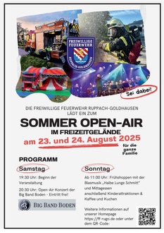 Der Festauftakt beginnt am 23. August 2025 um 19:30 Uhr mit einer feierlichen Begrüßung unserer Gäste. Im Anschluss sorgt die Big Band Boden ab 20:30 Uhr mit einem mitreißenden Open-Air-Konzert für musikalische Highlights. Freut Euch auf einen stimmungsvollen Abend voller Musik, Gemeinschaft und Sommeratmosphäre unter freiem Himmel. Eintritt frei – Diesen Abend solltet ihr nicht verpassen!