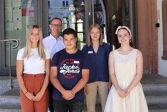 (v.l.) Bürgermeister Ulrich Richter-Hopprich, Noah Jösch, Julia Leineweber, Katharina Kolter, Sachgebietsleiter Personal, Organisation Roland Zöller.
