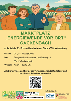 Die Ortsgemeinde Gackenbach lädt herzlich zur Abschlussveranstaltung des integrierten Quartierskonzepts ein. Unter dem Motto „Marktplatz „Energiewende vor Ort“ Gackenbach“ erwartet die Besucherinnen und Besucher ein vielfältiges Informations- und Austauschformat rund um die Zukunft der Energieversorgung.