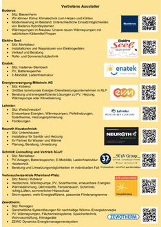 Insgesamt präsentieren neun regionale Unternehmen und Institutionen ihre Produkte und Dienstleistungen in den Bereichen Heiztechnik, PV, Batteriespeicher, E-Mobilität, Ladeinfrastruktur sowie energetische Sanierung. Während der Veranstaltung stehen die Ausstellenden den Besucherinnen und Besuchern für persönliche Gespräche und individuelle Fragen zur Verfügung.
