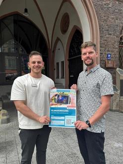Julian Herbst (links), Klimaanpassungsmanager der VG Montabaur und Thomas Siry, Klimaschutzmanager der VG Selters, bereiten den gemeinsamen Klimarundgang vor, bei dem Infrarotaufnahmen die Hitzebelastung im öffentlichen Raum sichtbar machen. (VG Montabaur/VG Selters)