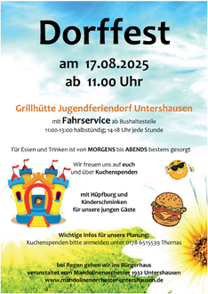 Am kommenden Sonntag, 17. August findet wieder unser traditionelles Dorffest statt. Auch in diesem Jahr feiern wir an der Grillhütte im Jugendferiendorf. Es gibt Leckeres von Schwein und Pute, Würstchen, Pommes, erstmals Burger sowie frisch gezapftes Bier und weitere Getränke. Am Nachmittag wird wieder selbst gebackener Kuchen und Kaffee angeboten. Kuchenspenden sind wie in jedem Jahr herzlich willkommen. (Bitte kurze Info an 0178/6515539) Macht euch auf zu ein paar geselligen Stunden an der Grillhütte und überlasst das leibliche Wohl dem Mandolinenorchester. Bitte beachtet unseren Fahrservice: von 11 Uhr bis 14 Uhr fahren wir halbstündlich zur Grillhütte und von 14 Uhr bis 18 Uhr bringen wir euch wieder an die Bushaltestelle. Wir freuen uns auf zahlreiche kleine und große Besucher.