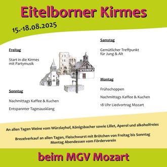 Es ist endlich soweit- wir feiern Kirmes. Der MGV Mozart freut sich über viele Besucher aus nah und fern an unserem beliebten Weinbrunnen. Das gesamte Wochenende ist für das leibliche Wohl bestens gesorgt. Ein besonderes Highlight- neben dem reichhaltigen Kuchenbuffet Sonntag und Montag- ist wie gewohnt der Auftritt vom Chor am Montagabend um 18:00 Uhr.
